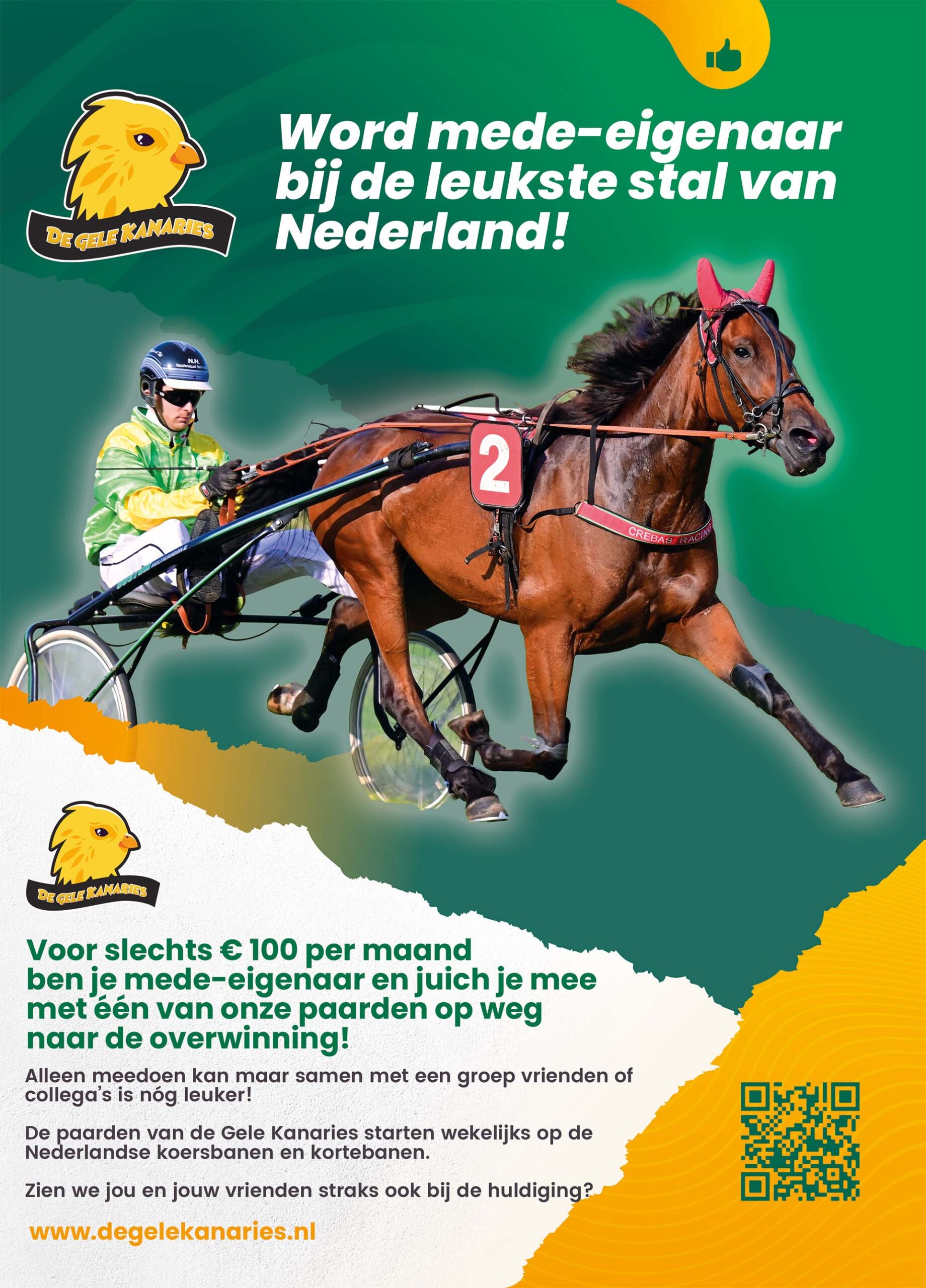 De paarden van de Gele Kanaries starten wekelijks op de Nederlandse koersbanen en kortebanen.